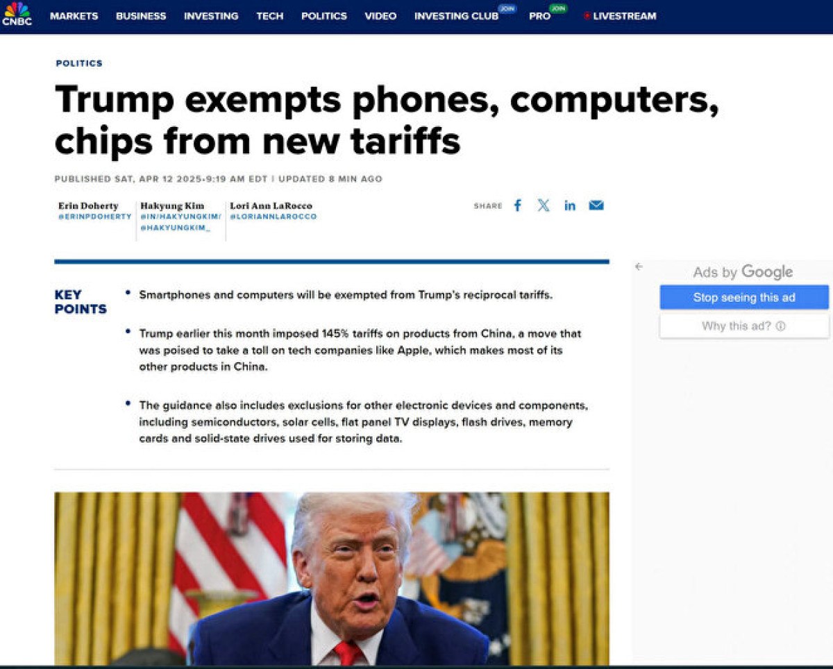 Yönergelere nazaran, yarı iletkenler, güneş panelleri, akıllı telefonlar, bilgisayarlar, düz ekran televizyon panelleri, flash bellekler ve hafıza kartları üzere birçok teknoloji eseri ve bileşeninin kelam konusu vergilerden muaf tutulacağı kaydedildi.