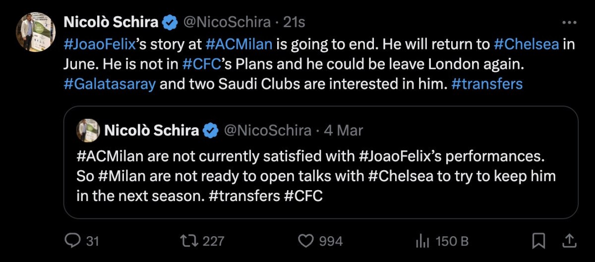 Chelsea’den devre ortası transfer periyodunda Milan’a kiralık olarak giden Joao Felix, İtalya’da da aradığını bulamadı.