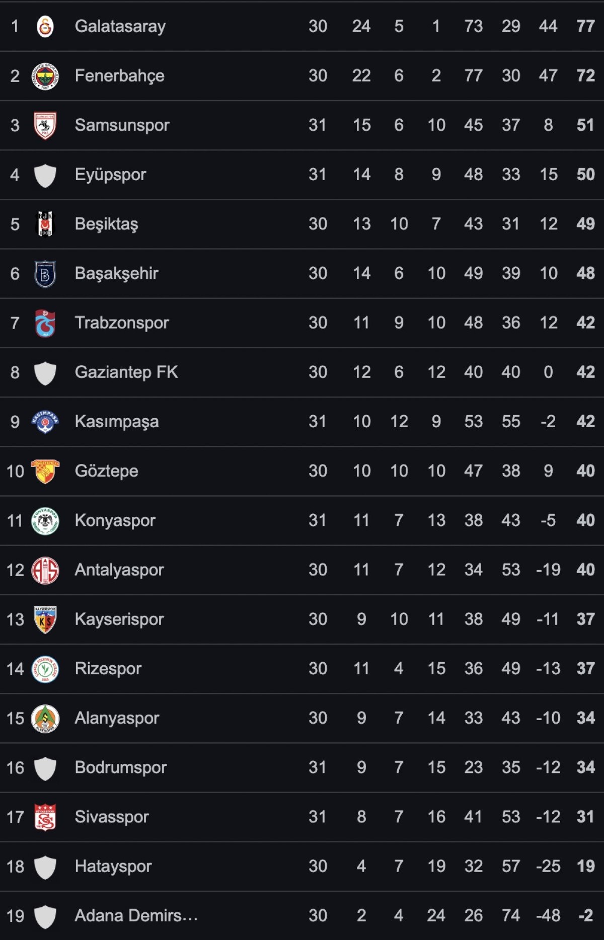 İşte Süper Lig’de 32. hafta maçlarının tamamlanmasının akabinde ortaya çıkan puan durumu…