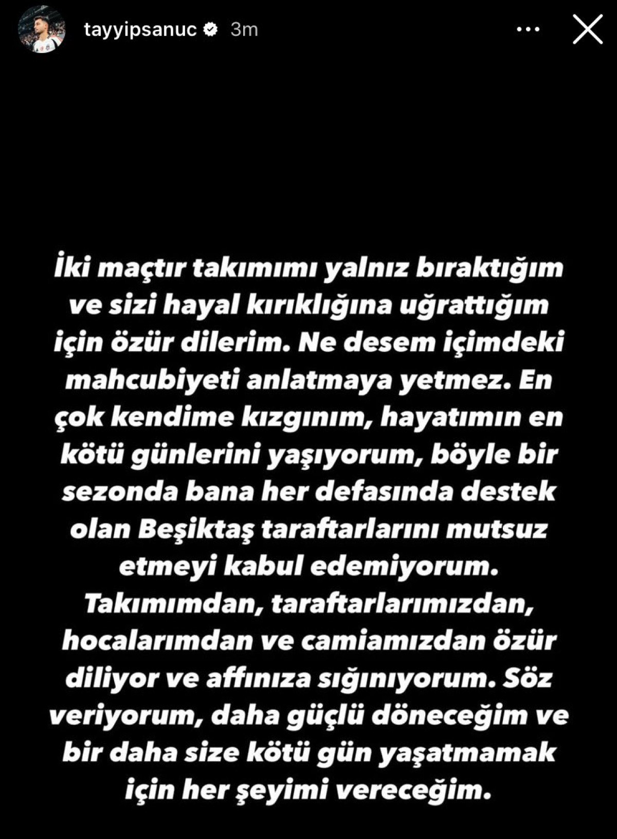İki maçtır ekibimi yalnız bıraktığım ve sizi hayal kırıklığına uğrattığım için özür dilerim. Ne desem içimdeki mahcubiyeti anlatmaya yetmez. En çok kendime kızgınım, hayatımın en makûs günlerini yaşıyorum. Bu türlü bir dönemde bana her kezinde dayanak olan Beşiktaş taraftarlarını mutsuz etmeyi kabul edemiyorum. Ekibimden, taraftarlarımızdan, hocalarımdan ve topluluğumuzdan özür diliyor ve affınıza sığınıyorum. Kelam veriyorum, daha güçlü döneceğim ve bir daha size berbat gün yaşatmamak için her şeyimi vereceğim.